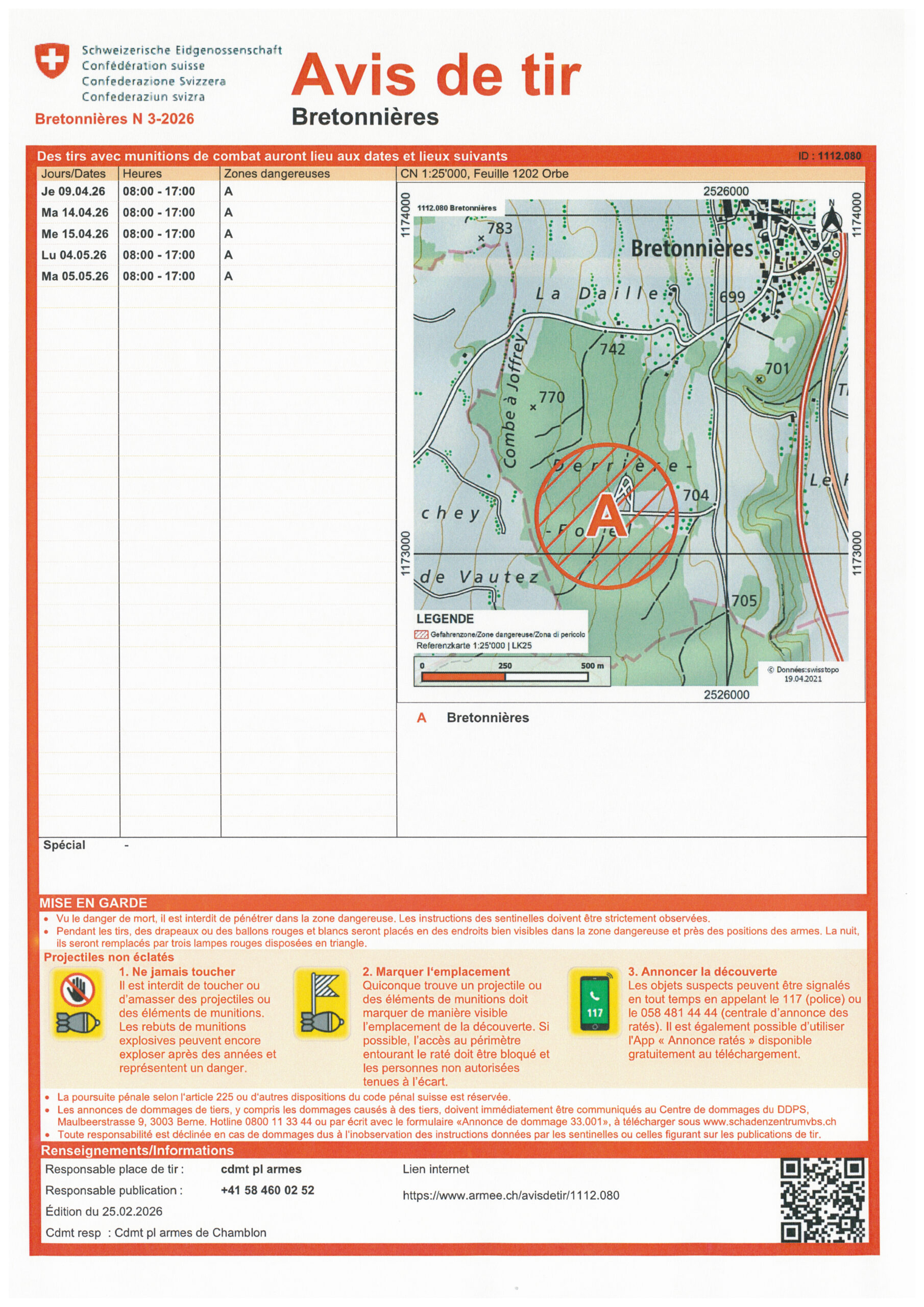 Avis de tirs du 9 avril au 5 mai 2026 – Bretonnières Date 27 Fév 2025 - 06 Mai 2026 Chargement... Heure Journée entière Catégorie Pilier public Partagez cet événement